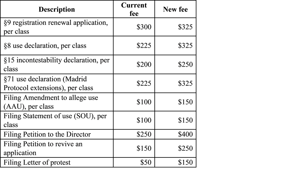 The USPTO is increasing several trademark-related fees, including those relating to post-registration maintenance requirements, such as renewals, declarations of use, and declarations of incontestability. There are, however, no changes to fees pertaining to proceedings before the Trademark Trial and Appeal Board, such as ex-parte appeals, oppositions and cancellations. The table below lists the main categories that will experience fee increases.