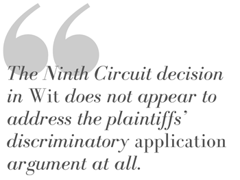 The Ninth Circuit decision in Wit does not appear to address the plaintiffs’ discriminatory application argument at all. Further, the Ninth Circuit’s memorandum decision limits its ruling to the specific facts of the Wit case. Interestingly enough, the Ninth Circuit declined to recite the facts in its decision, so we do not know the facts they paid particular attention to or which facts they ignored.